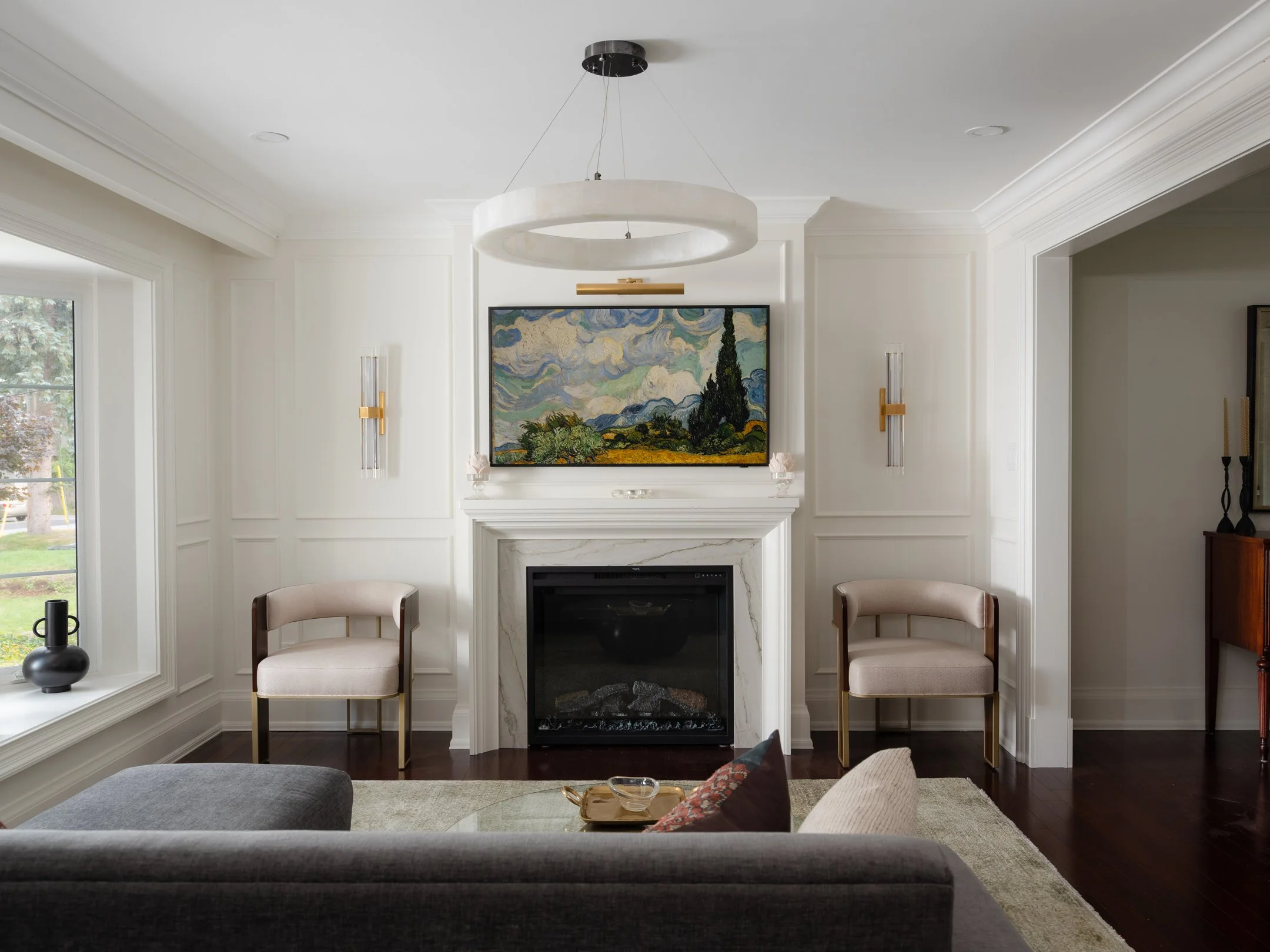 (3D Rendering) The fireplace/TV wall came together easily. We removed the existing console that spanned from wall to wall (which we re-used on another wall) and built-out the wall for an electric fireplace. We kept the details classic and elegant. The lighting and furniture options shifted along the way, but the design of the wall remained unchanged throughout.